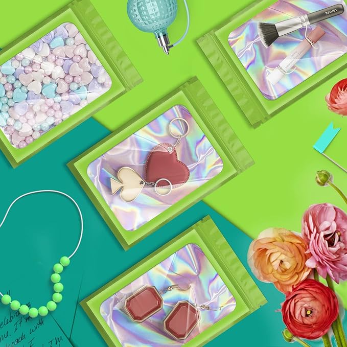 100 Pieces Smell Proof Mylar Bags, Holographic Packaging Bags, Resealable Odor Foil Pouch Zipper Bag with Clear Window for Food Storage and Lipgloss, Jewelry Lash (Green, 4 x 6 Inch)