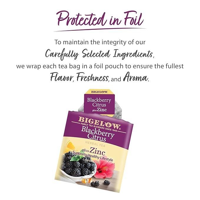 - Individually Wrapped: Bigelow Tea always come individually wrapped in foil pouches for peak flavor, freshness and aroma to enjoy everywhere you go; Gluten-free, calorie-free, and Kosher Certified