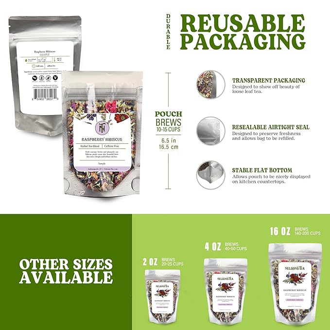 - LUXURIOUS AND DECADENT TASTE: Dive into the lush flavors of Nelson's Tea Raspberry Hibiscus with Green Rooibos Tea Loose Leaf, where the tartness of raspberry meets the floral notes of hibiscus for a cup that's refreshing. This blend gives a sensory delight to those who cherish a sweet, aromatic escape.