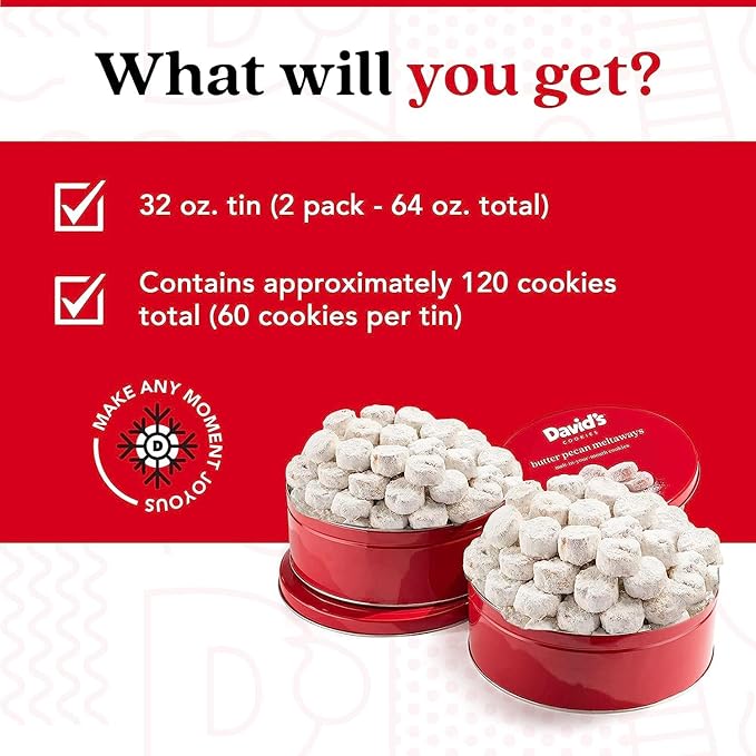 David's Cookies Gourmet Butter Pecan Meltaway Round Tin with Crunchy Pecans and Powdered Sugar, All-Natural Ingredients, Kosher, Ideal Present for Special Occasions, 64 Oz (2 Pack)