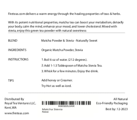 FIRE TEAS Sugar Free Matcha Tea with Stevia - Naturally Sweetened Green Tea Powder -)