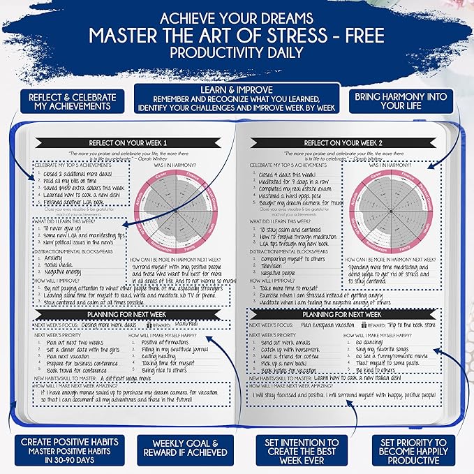 - GRATITUDE JOURNAL - This deluxe daily planner and self-care journal comes in A5 size (5.8 x 8.3 inches). The life planner comprises 264 pages of thick 100 gsm paper, including 90 daily planning sheets, guiding you on how to become the best possible version of yourself on a mental, physical, and interpersonal level. It's a unique diary based on leading scientific studies proven to increase productivity and happiness. The journal features an out-foldable vision board to help you stay focused, morning and evening power questions, mind maps, reflection pages, habit trackers, a back pocket, and much more than any other planner on the market!