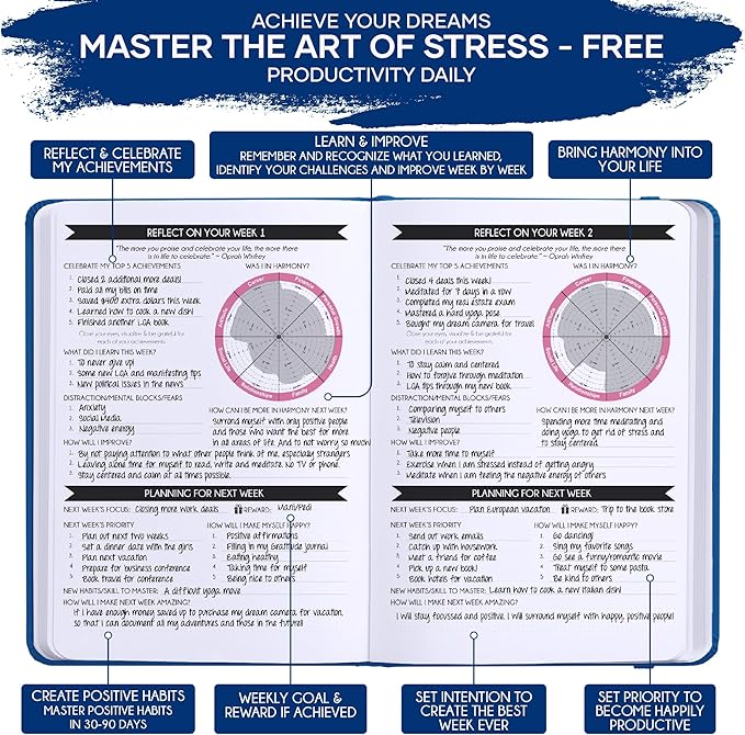 - SELF-CARE JOURNAL - This deluxe daily planner and gratitude journal for women comes in A5 size (5.8 x 8.3 inches). The life planner comprises 264 pages of thick 100 gsm paper, including 90 daily planning sheets, guiding you on how to become the best possible version of yourself on a mental, physical, and interpersonal level. It's a unique diary based on leading scientific studies proven to increase productivity and happiness. The journal features an out-foldable vision board to help you stay focused, morning and evening power questions, mind maps, reflection pages, habit trackers, a back pocket, and much more than any other planner on the market!