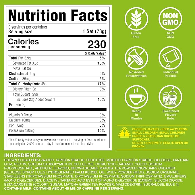 - WHAT IS INSIDE – 3 Individually wrapped portions of brown sugar flavored boba, 3 matcha milk tea packets, & 3 extra wide paper straws. Store in a cool, dry place (no refrigeration necessary).