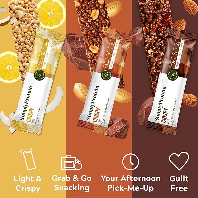 Simply Protein - Crispy Vegan Protein Bars Variety Pack, 3 Flavors - Plant Based, Protein Snacks - 13g Protein, 2g Sugar, 7g Fiber - Gluten Free, Non GMO, Kosher - 12 Bars, 3 Boxes