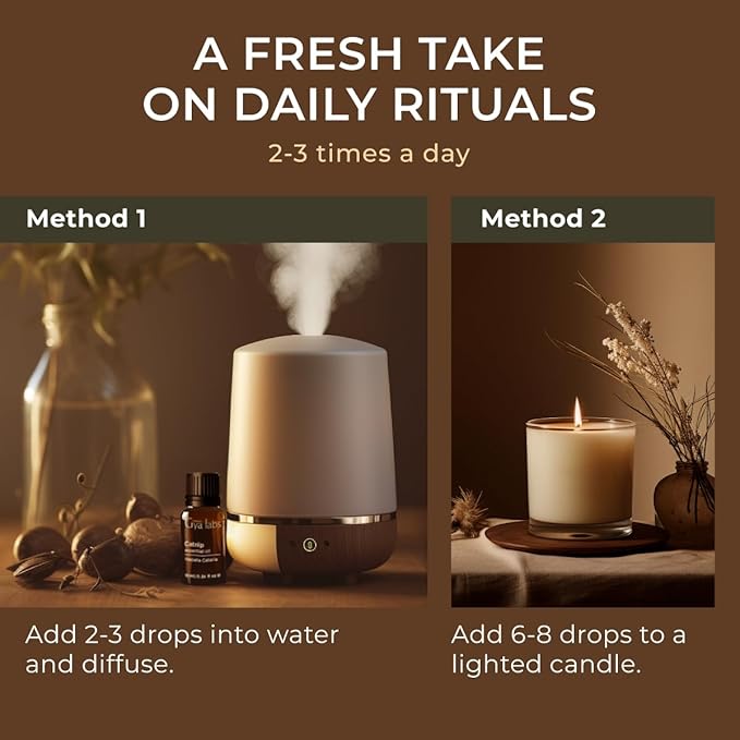 - Catnip essential oil for diffuser & candles. Indulge in our catnip essential oil for an uplift, especially after those longer days. Add 2-3 drops in a catnip essential oil diffuser or when candle making to refresh your evening routines.