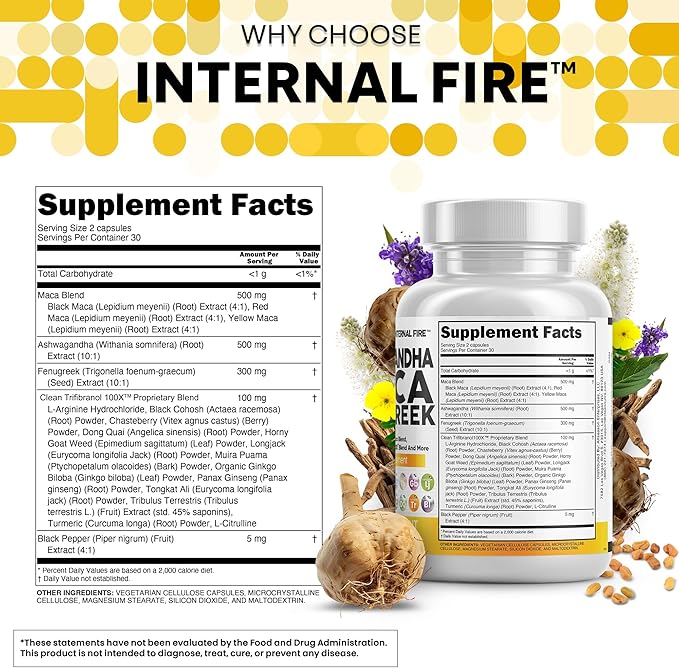 - The Ultimate Ashwagandha Extra Strength with Maca Root Capsules You've Been Looking For - Clean Nutra's Internal Fire provides 3 full-dose Herbal Supplements in one, containing a full Pure Maca Root, Fenugreek Capsules, and Ashwagandha Root in a convenient 2 capsule dosage. Finally, Red Maca Root Capsules for Women and Black Maca Root Capsules For Men have been combined into one solution that also contains a Fenugreek Supplement.