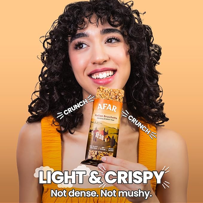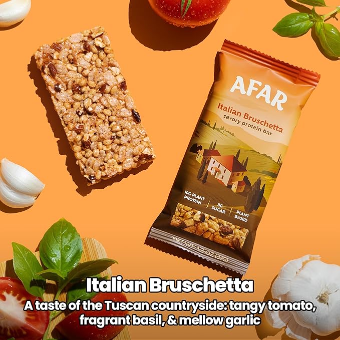 Afar Savory Protein Bars – Low Sugar, High Protein – Healthy Snacks for Adults – Meal Replacement Bar – Rice Crispy Texture – Vegan, Gluten Free (8 Bars, Italian Bruschetta)