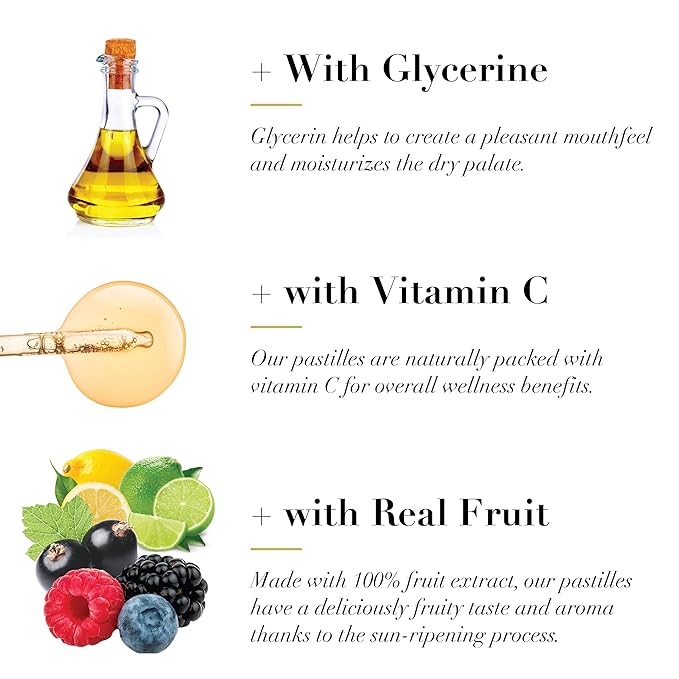 - Key Ingredient: Our pastilles moisturize the mouth thanks to the beneficial properties of glycerin, one of the most valuable components in our recipe. It leaves the palate feeling pleasant and refreshed.