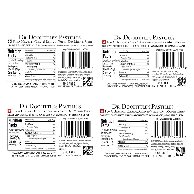 Dr. Doolittle’s Soft Fruit Pastilles Sugar Variety Pack for Voice and Throat, Blackcurrant, Lemon Lime, and Wild Berries, 2.12 Ounce Tin, approximately 25 Count Package, 4 Pack