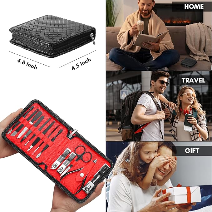 - 【Mani Pedi Kit with Luxury Fashion Case】 Our Stainless Steel Manicure Kit with a black gorgeous leather case makes it a fashionable and popular gift for your relatives, friends, parents, and the husband. Lightweight and portable travel essentials can offer exceptional foot, hand, and facial grooming tools. Nail kit suitable for many occasions which is your perfect travel companion