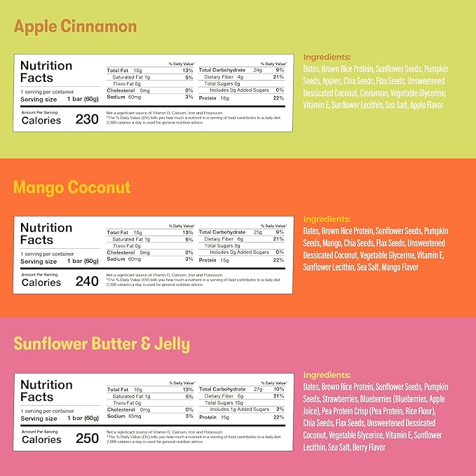 - 12+ Superfoods in Every Bar – Our bars pack indulgent flavor with healthy ingredients like Dates, Brown Rice Protein, Sunflower Seed Butter, Pumpkin, Chia & Flax Seeds, Unsweetened Coconut, Apples, Blueberries, Mango, Pineapple, Strawberries, Maca and Puffed Quinoa for nutrient-rich snacking.