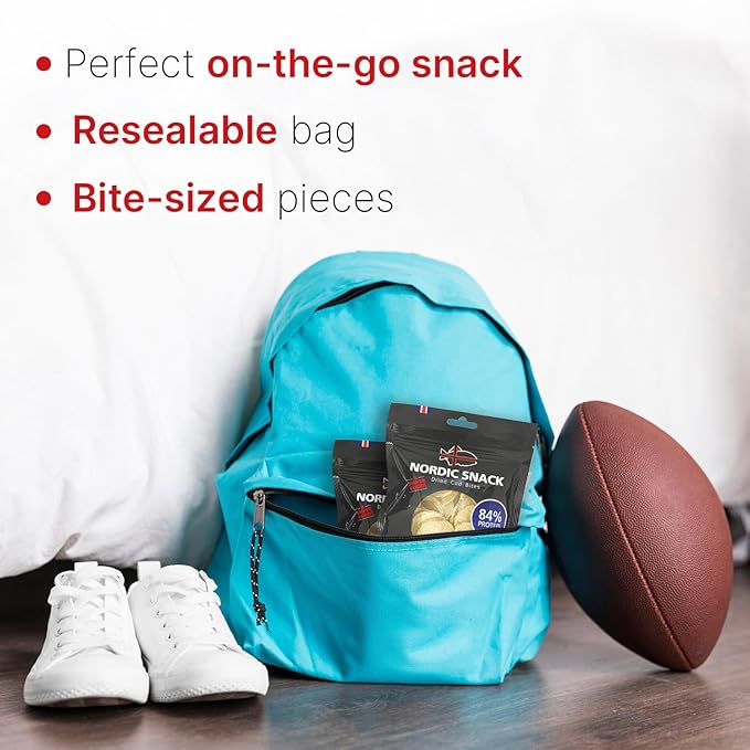 - DIET FRIENDLY KETO SNACK: Our Freeze Dried Cod Bites are packed with 29 grams of protein, 120 calories and are rich in omega 3 fatty acids, making this seafood snack keto friendly! These fish bites are also free of gluten and sugar so people with gluten allergies or with diabetes can dive into the delicious flavors of Iceland. We use a little bit of sea salt to season these bites so they are also a low-sodium norwegian food and are a healthier option compared to other fish jerky and meat chips. If you like cod skins, you will definitely fall in love with these dried fish snacks.