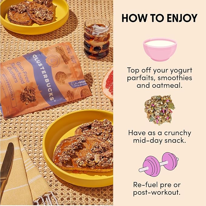 - HOW TO ENJOY - Add Clusterbucks to your morning smoothies, yogurt parfaits, and oatmeal, or grab them as a healthy snack while on the go. Pack them in your lunch bag or keep them as a crunchy snack on your hikes and other adventures.