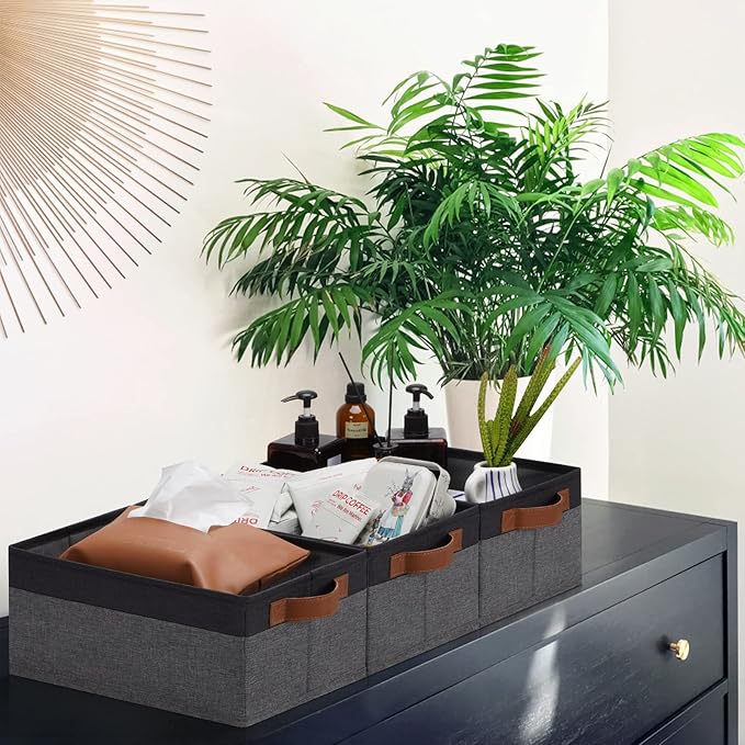 - 【QUALITY MATERIAL】Storage baskets for shelves are made of high-quality cationic fabric and polyester cotton fabric, and the inner layer is made of non-woven fabric, which is odorless, long-lasting and strong. Classic faux leather handles that adds a comfortable touch and provides a strong and comfort grip to pull and move. Fabric storage bin is easy to clean, just wipe with a damp sponge or cloth