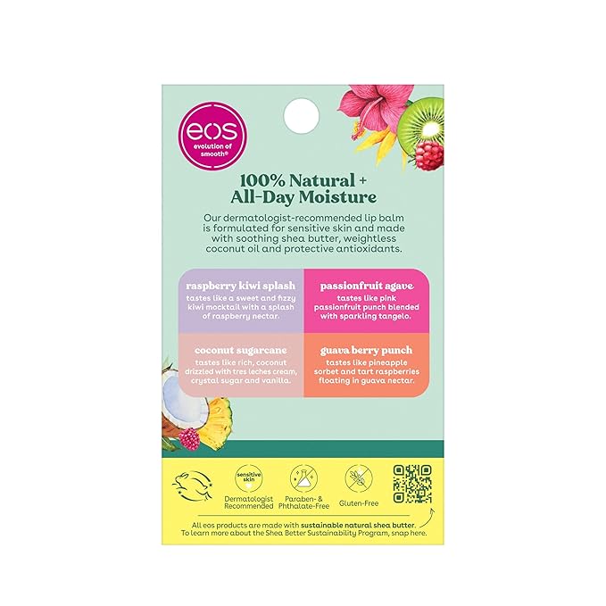 eos 100% Natural Lip Balms - Raspberry Kiwi Splash, Passionfruit Agave, Coconut Sugarcane, & Guava Berry Punch, All-Day Moisture Lip Care, 0.14 oz, 4-Pack