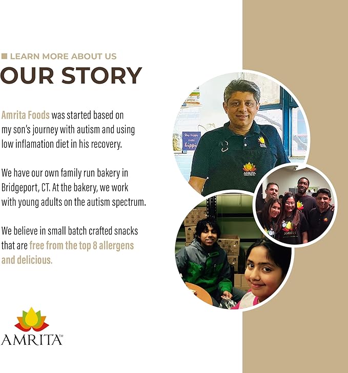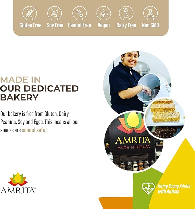 - The Amrita Promise - Enjoy our vegan snacks, crafted in small batches in our allergen-free family-run bakery. We proudly support young adults with autism through our hiring practices and stand by our products.