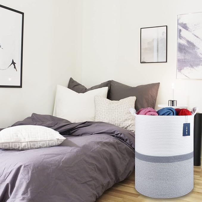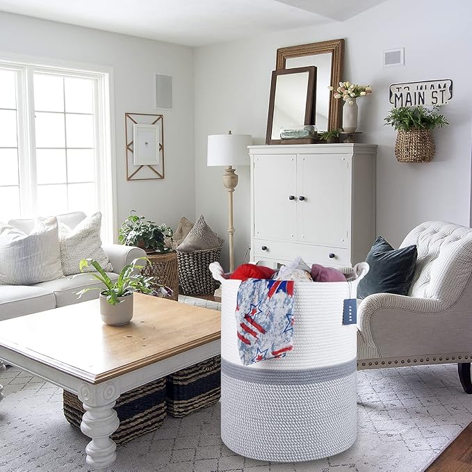 COMSE Extra Large Blanket Basket, Tall Woven Storage Basket, Nursery Hamper, 15.7”x 21.7”, Cotton Rope Laundry Hamper for Toys Clothes Towels, Blend White/Gray