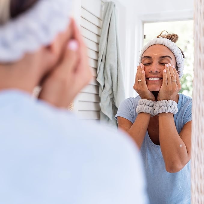 - Unlike other face wash headband styles, this fluffy face washing headband includes two matching gray wristbands that prevents water from running down your arms