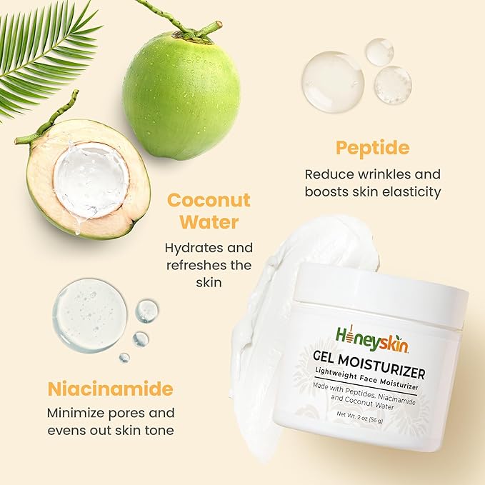 Honeyskin Gel Moisturizer for face – Lightweight Water Gel Infused with Coconut water with Niacinamide & Peptides for Deep Hydration – Hypoallergenic Face Moisturizer for Women 2oz