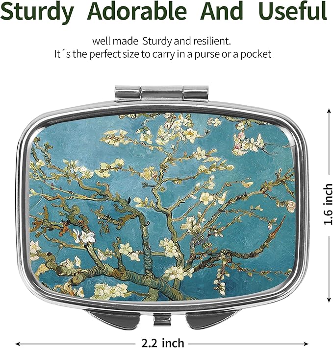 Dynippy Pill Case Pill Box with Mirror Retro Pocket 2 Compartment Medicine Case Vitamin Pill Organizer for Pocket Purse and Travel (Silver-Almond Blossom)