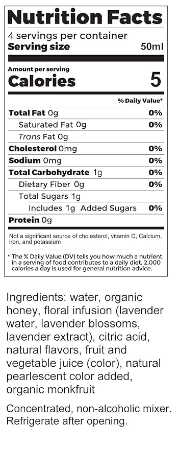 - REAL INGREDIENTS - Made with professional bartenders, our products are made with real ingredients for authentic and quality drinks. Made with mineral shimmer from the earth, superfruits and botanicals for color, our subtle and delicate Lavender Infused Syrup is not overpowering, not sugary and meant to compliment your beverages.