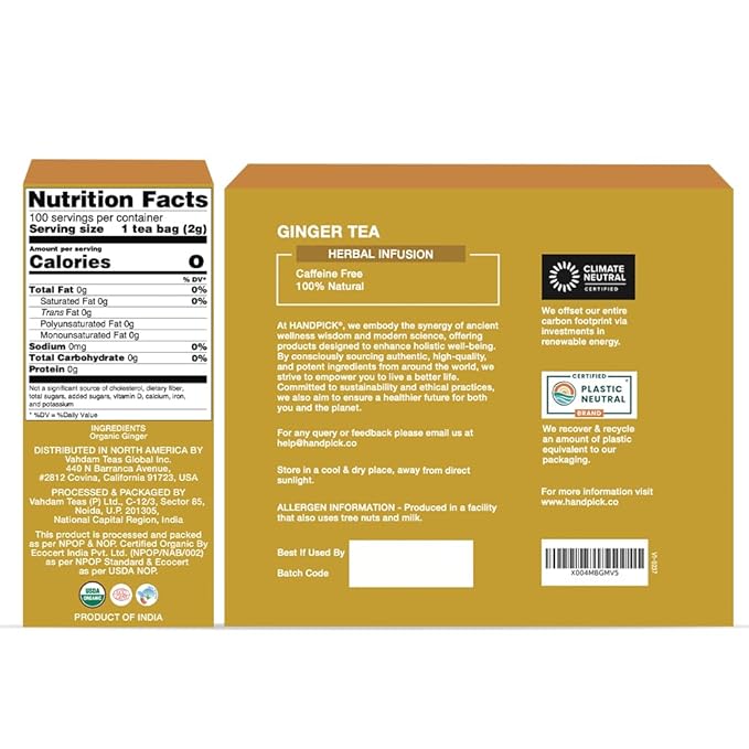 HANDPICK, Organic Ginger Tea Bags (100 Herbal Tea Bags), Authentic Indian Origin, Caffeine Free & 100% Pure Ginger Root |Soothing & Spicy Blend | Round Eco Conscious Teabags