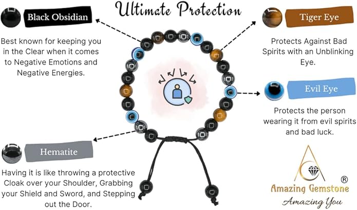 - Evil Eye Bracelet for Ultimate Protection from Negative Energy is made of real crystal mens bracelets beads Hematite, Tiger Eye, Black Obsidian and most important and unique Evil Eye Stocking Stuffers.
