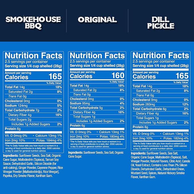 - VARIETY OF GOOD FLAVORS: We have six great of flavors to choose from--Original (Salty), Parmesan & Pepper (Savory), Hatch Green Chile (Spicy), Smokehouse BBQ (Smokey - Barbecue), and Dill Pickle (Sour). All available as 3-packs, each pack contains 4.0 oz. bags of jumbo, low salt sunflower seeds. Makes a great stocking stuffer!