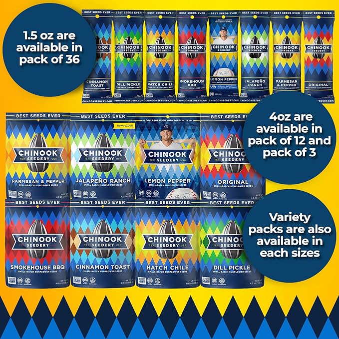 - GREAT FOR GROUP & SOLO EATING: Ideal for baseball, road trips, camping, fishing, hunting, disc golf, & softball. No matter what your adventure, having a bag of Chinook nearby keeps you fueled for success. There's just something about cracking and spitting seeds that put you in a winning mindset. The official sunflower seed of USA Baseball and partnered with Bobby Witt Jr. of the Kansas City Royals, itβs also a perfect snack to have in the dugout at your next baseball game.