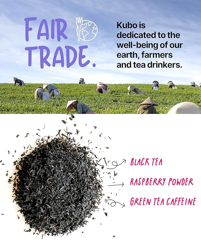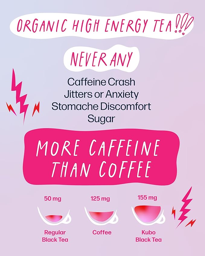 Kubo Tea Organic High Energy Iced Tea - High Caffeine Raspberry Blend - Healthy Coffee Substitute w/ 20 Servings (155mg Caffeine each) - Great for Hot & Cold Brew, Pillow Bags, Compostable Packaging