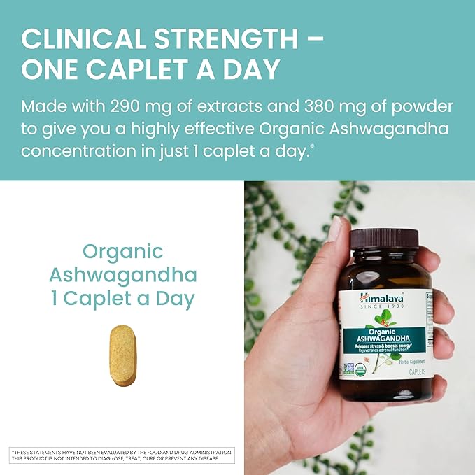 Himalaya Organic Ashwagandha Root, 30 Day Supply - Herbal Adrenal Support Supplements for Stress Relief and Energy Support - USDA Organic, Non-GMO, Vegan, Gluten Free, No Additives, 670 mg, 30 Caplets