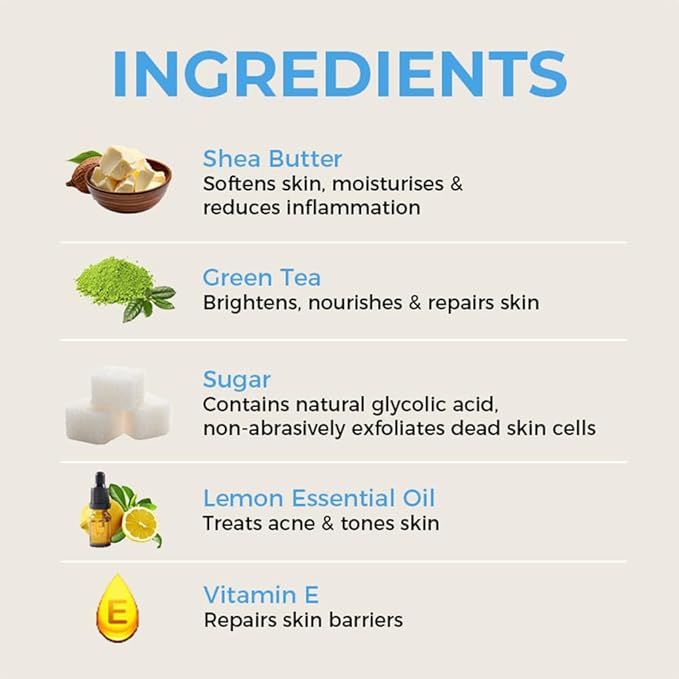 - Bid goodbye to dull & tanned skin with green tea body scrub that contains lemon and moisturizing raw sugar. A fragrant addition to your skincare routine. Whipped sugar scrubs have a rich, foaming lather as well as gently exfoliate. They offer ample moisture, ensure clean skin & remove all dead skin cells.