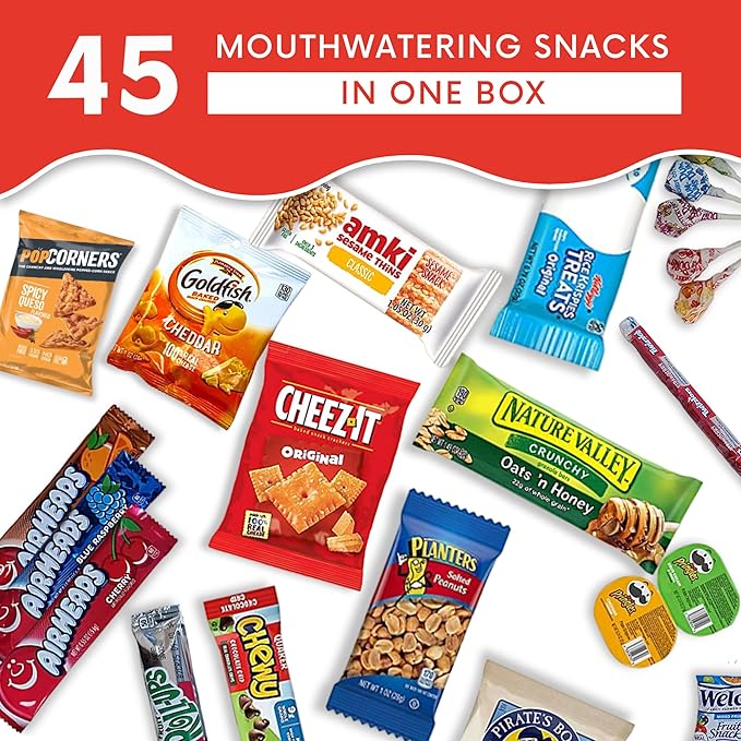 - Variety: With a blend of sweet, salty, chewy, and crunchy snacks, this healthy snack box caters to every craving. Indulge in chocolates, candies, nuts, and granola bars for a delightful snacking experience with chips, cookies, bars, popcorn, and crackers. It is the best variety pack on Amazon as it has all your favorite individually wrapped snacks. It's a deluxe snacks experience with the biggest value sampler snacks box - bulk, gift basket, variety fun assortment pack.