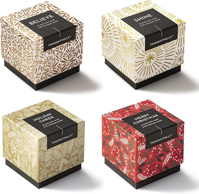 - THEME – CHRISTMAS CHEER: Included in this pack are 4 boxes of ThoughtFulls - 1 box of Believe, 1 box of Shine, 1 box of Holiday Cheer, and 1 box of Merry Christmas. Every box features 30 cards, each with a unique quote to welcome the season's wonder. Tuck these ThoughtFulls into holiday cards, use them as gift tags, or open them yourself to reconnect with joy.