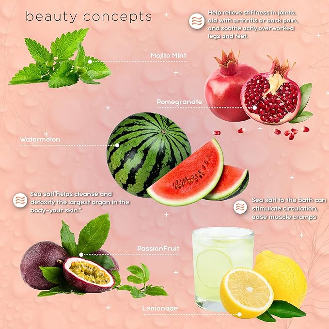 - RELAX AND REFRESH- Delight your senses and relax at home with this aromatherapy bath salt set from Beauty Concepts. These salts will immediately reduce stress and anxiety, while relieving any muscle soreness.