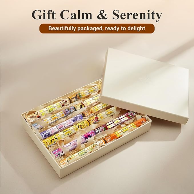 - SET INCLUDES: 240 incense sticks (12 x 20Pc). This Tulasi Incense Stick Gift Pack includes 12 different fragrances boxes, each box contains 20 sticks | Coconut, White Sage, Red Rose, Patchouli, Lavender, Jasmine, Frankincense & Myrrh, Sandalwood, Palo Santo, Violet, Cinnamon, and Vanilla.