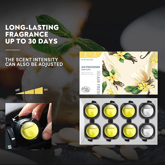 - Simple to Use: Clips easily onto car vents and stay firmly in place; allows you to select the level of freshness intensity; set of 8, each up to 30 days, total up to 240 days steady fragrance experience