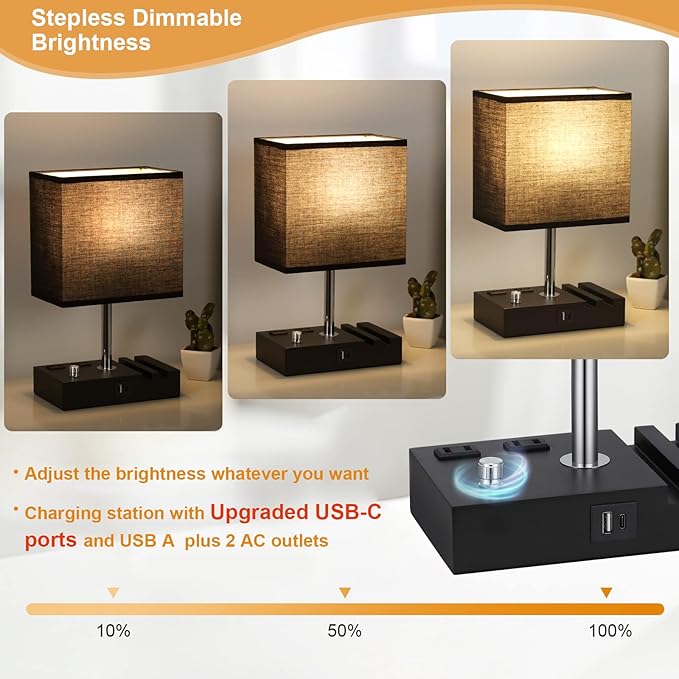 - Fully Dimming Bedside Lamp for Bedroom: By rotating the knob switch to adjust the brightness from 0% to 100% whatever you want smoothly and simply to meet all your need. The dimmable bedside lamp with USB charging port and type C port offer fully dimming lighting, so that you could accommodate a variety of usage scenarios and enjoy the interesting lighting experience for working, reading and relaxing