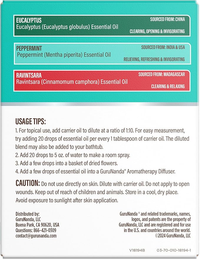 GuruNanda Breathe Essential Oil Set (Pack of 3 x 0.34 Fl Oz) - 100% Pure, Natural & Undiluted Diffuser Oils for Aromatherapy - Helps Support Clear Breathing - Suitable for Massages & DIY Recipes