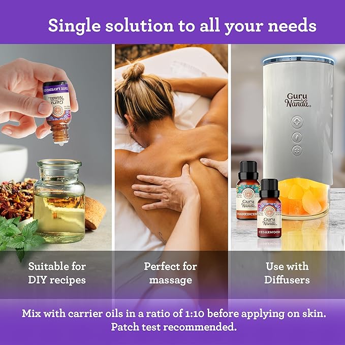 - 100% PURE & NATURAL ESSENTIAL OILS: Crafted meticulously, GuruNanda Sleep Essential Oil consists of pure and natural Lavender, Cedarwood and Frankincense goodness. Sourced from the finest blooms in Bulgaria, USA and all around the world, it captures the true essence of nature. Each essential oil is encased in a 10 ml amber glass bottle with an oil dropper. Free from additives or fillers, ensuring an extended shelf life.