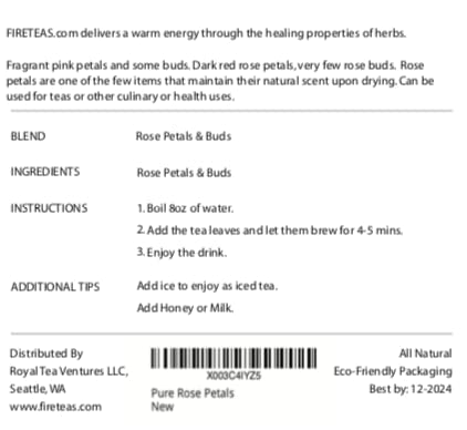 FIRE TEAS Pure Rose Tea - Dried Rose Petals, Buds & Flowers - Packaged in the USA.