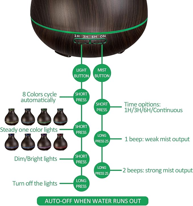 - SLEEK and ELEGANT LOOKING, 8 COLORS: The aromatherapy essential oil diffuser is made of plastic with a faux wood look, BPA-Free water tank, fine design, and good quality, it blends naturally with the most home decor. The changeable colored lights bring an elegant view, create a relaxing atmosphere to the room, and make your life more colorful.