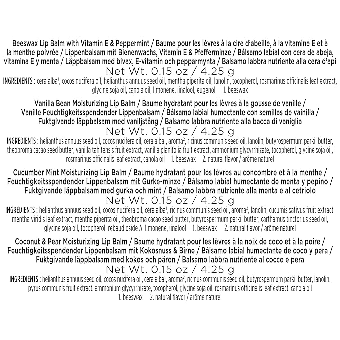 - FOUR FLAVORS: With four flavors, including Beeswax, Vanilla Bean, Cucumber Mint, and Coconut and Pear, this lip balm is a perfect gift for holidays like Valentine's Day, Easter and Mother's Day