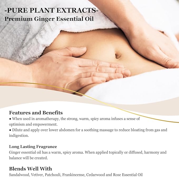 - Scent Characteristic: Pure Ginger essential oil which extracts from plant not add any additives, fillers. It has the unique spicy, warm and sweet aroma.