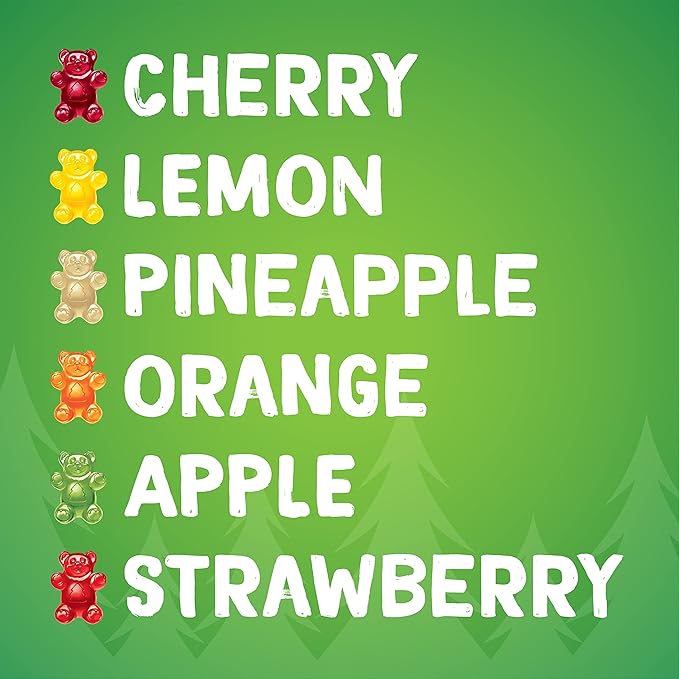 - REAL JUICY, REAL GOOD: This case includes 12 individually wrapped 4.5 ounce bags of bear shaped gummies in 6 fruity flavors of Strawberry, Cherry, Apple, Pineapple, Orange, and Lemon