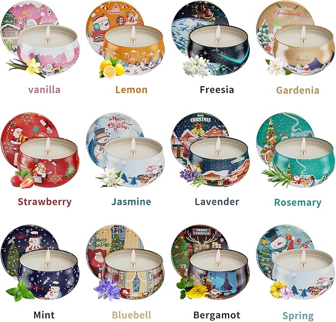- Exquisite jar & long-lasting time: Each candle has a jar with exquisite Christmas scenes patterns, suitable for decorating your home or storing some little things once used up. Every scented candle contains 2..5 oz soy wax and can last 15 to 20 hours and the 12 pack scented candles totally burn time up to 240 hours. Just enjoy the long-lasting fragrance with pleasure.