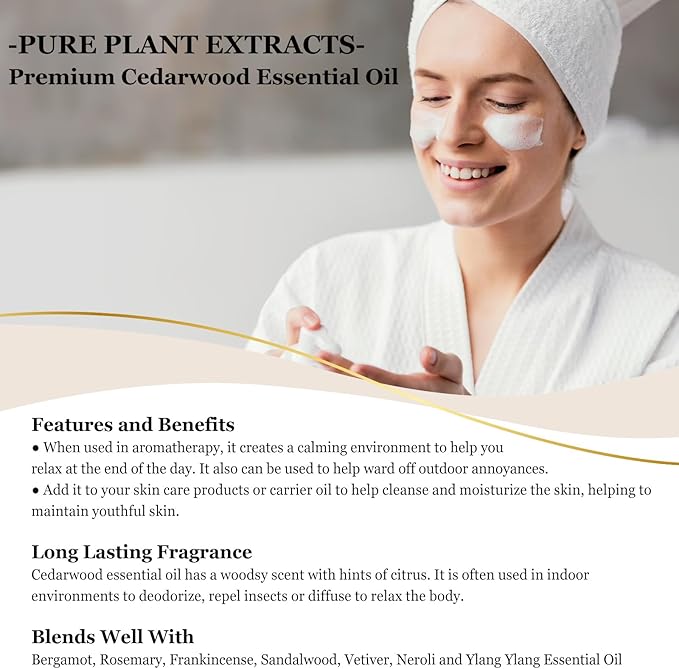 - Scent Characteristic: Cedarwood essential oil is extracted from the flowers, leaves, stems, roots or fruits of Cedarwood by evaporation of water vapor, not add any additives, fillers. The light woody fragrance makes you feel the breath of being in the forest.