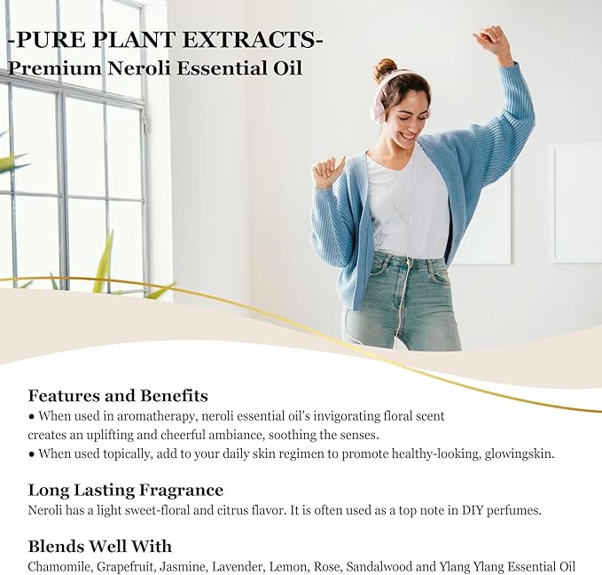 - Scent Characteristic: Our neroli essential oil is extracted from nature orange blossom, not add any additives, fillers. It has both a sweet floral aroma and a bitter aftertaste. Its fragrance is better for women to relax and more enjoy life.