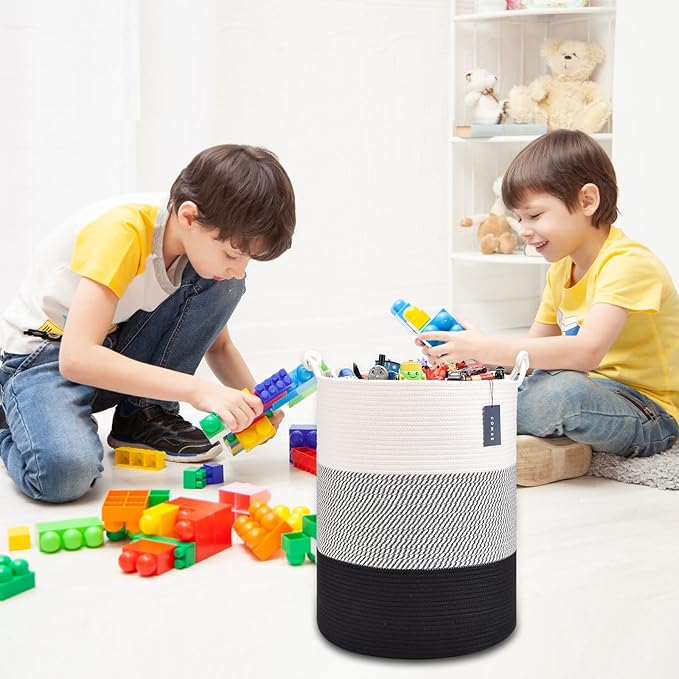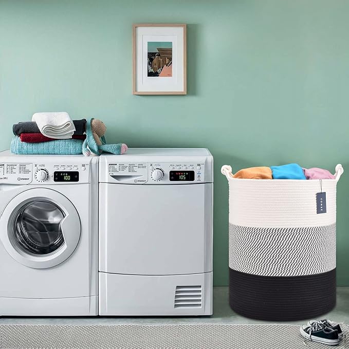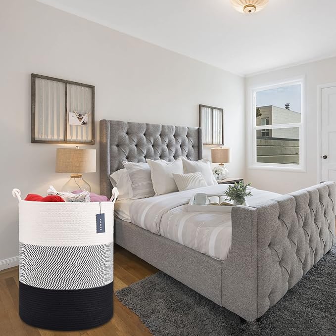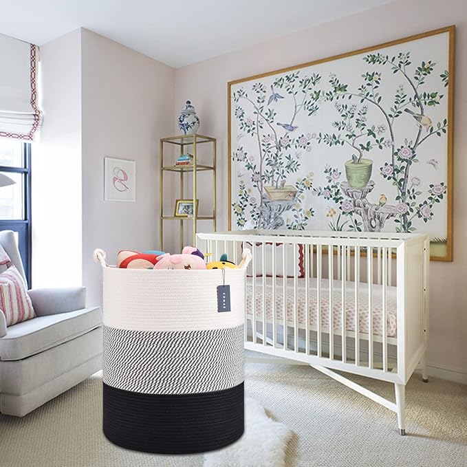 COMSE Extra Large Blanket Basket, Tall Woven Storage Basket, Nursery Hamper, 15.7”x 21.7”, Cotton Rope Laundry Hamper for Toys Clothes Towels, White/Gray/Black